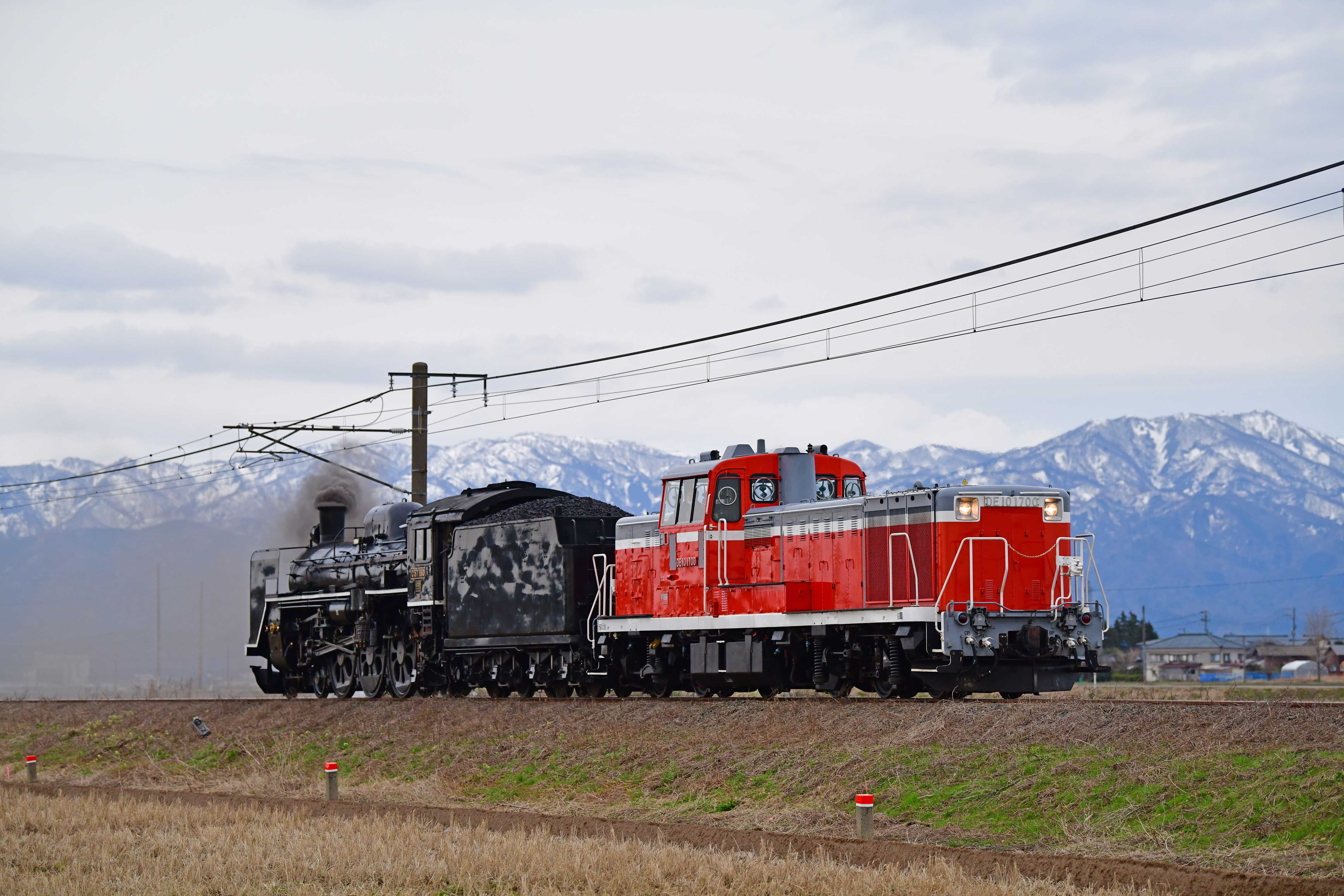 初日は夕方の便を撮影して翌日は朝からDE10を撮影して夕方の回送を水原駅で撮影しようという計画である。まずは水原〜京ヶ瀬の水田区間へやってきた。3月末とはいえ強風やら何やらで日本海側のダイヤは少々乱れており貨物列車は今頃来るのかよ!というスジで定期列車を交わしていた。一方の往路のSLひな街道号で使用したC57180はDE10の牽引で村上から新津へ回送されてくるのだが、後から発車したEF81牽引のELひな街道号に抜かれるというゆっくりとしたダイヤだ。しばらく待っているとEF81134牽引のひな街道号が通過し、京ヶ瀬で下り普通列車と交換。この列車が水原で回送列車と交換したらいよいよDE10の出番だ。しばらくして踏切が鳴り皆様カメラを構える。もう最後のキリ番ガマとなってしまった1700号機がC57180を従えてゆっくり通過。SLにはヘッドマークが装着されているがテンダー側は何も装着されていないので、いかにも国鉄時代の重単と行った趣だ。汽笛合図でゆっくり加速して駅を通過していった。背後は雪山だし国鉄野郎も納得の光景です。
