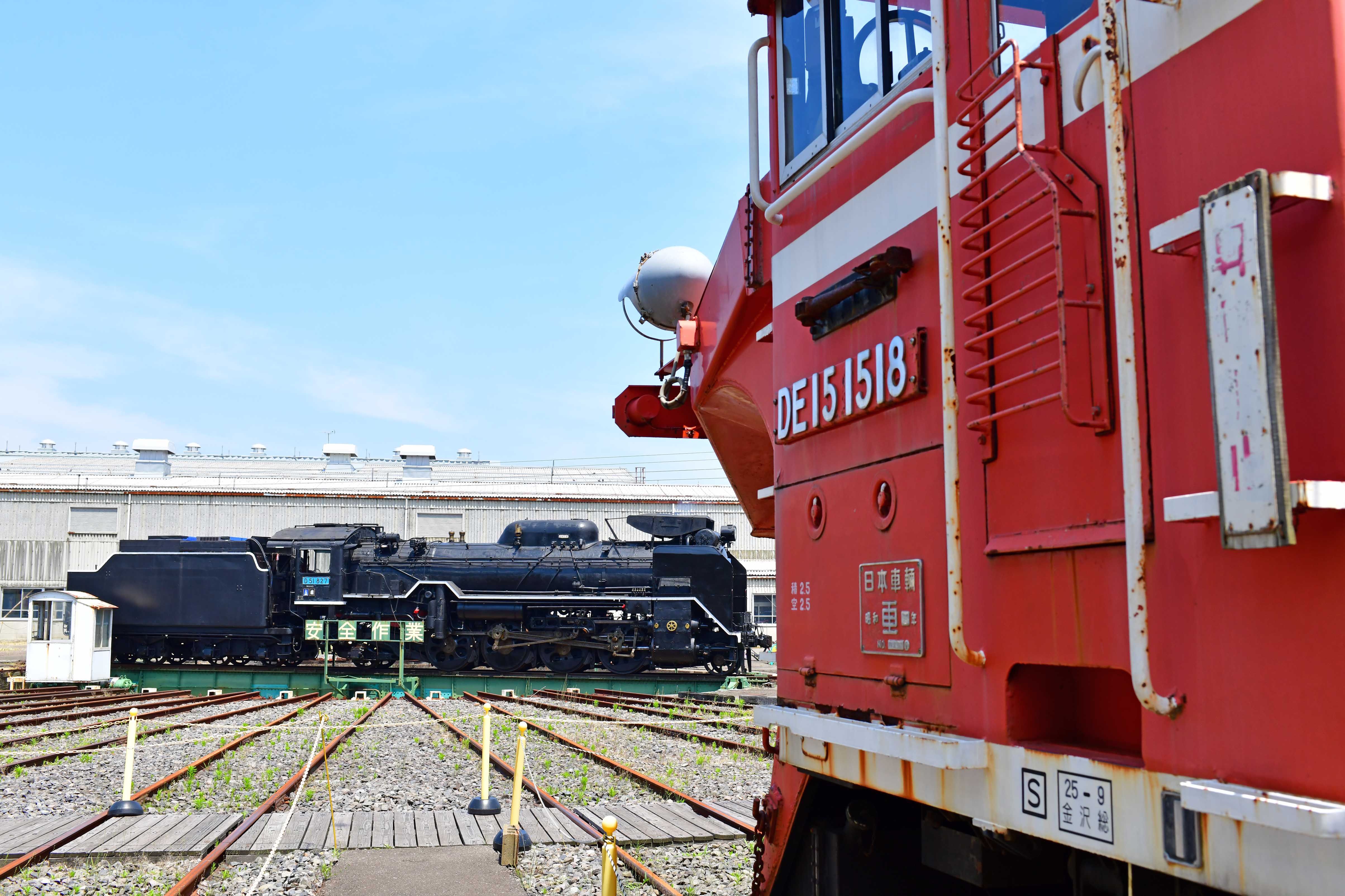 しばらくDE15を撮影してからオヤ31を冷やかし、D51827を撮影する事にした。圧搾空気で構内を車掌車従えてゆっくりと往復するだけなのだが普段498号機を見慣れているせいか、いつもと違った風格が漂っている。しばらく往復運転したあと、ヨを切り離して転車台に載るようなのでハッと気付いてDE15の元へ急行。広角レンズでDE15のラッセルヘッドを手前に入れつつ転車台に載るD51を撮影しようと思いついた。ゆっくりとD51転車台に載ったところでシャッターを切ってみた。そこには国鉄な光景が展開していた。汗だくになるのを忘れて撮影に夢中になってしまった。